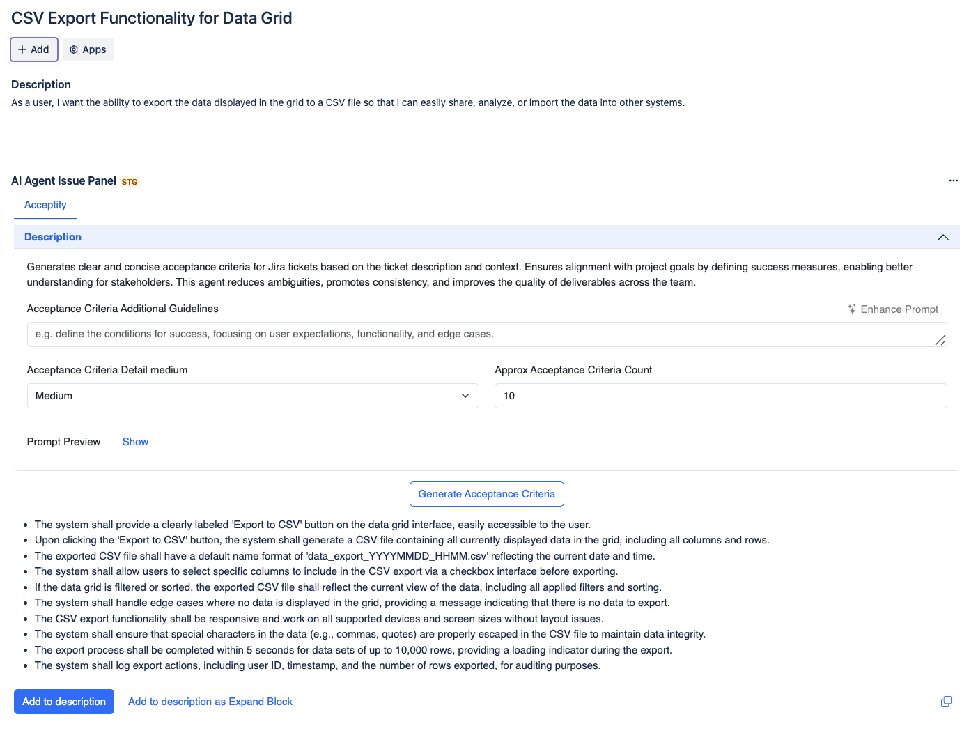 Add to Description: Insert the generated acceptance criteria directly into the issue description.