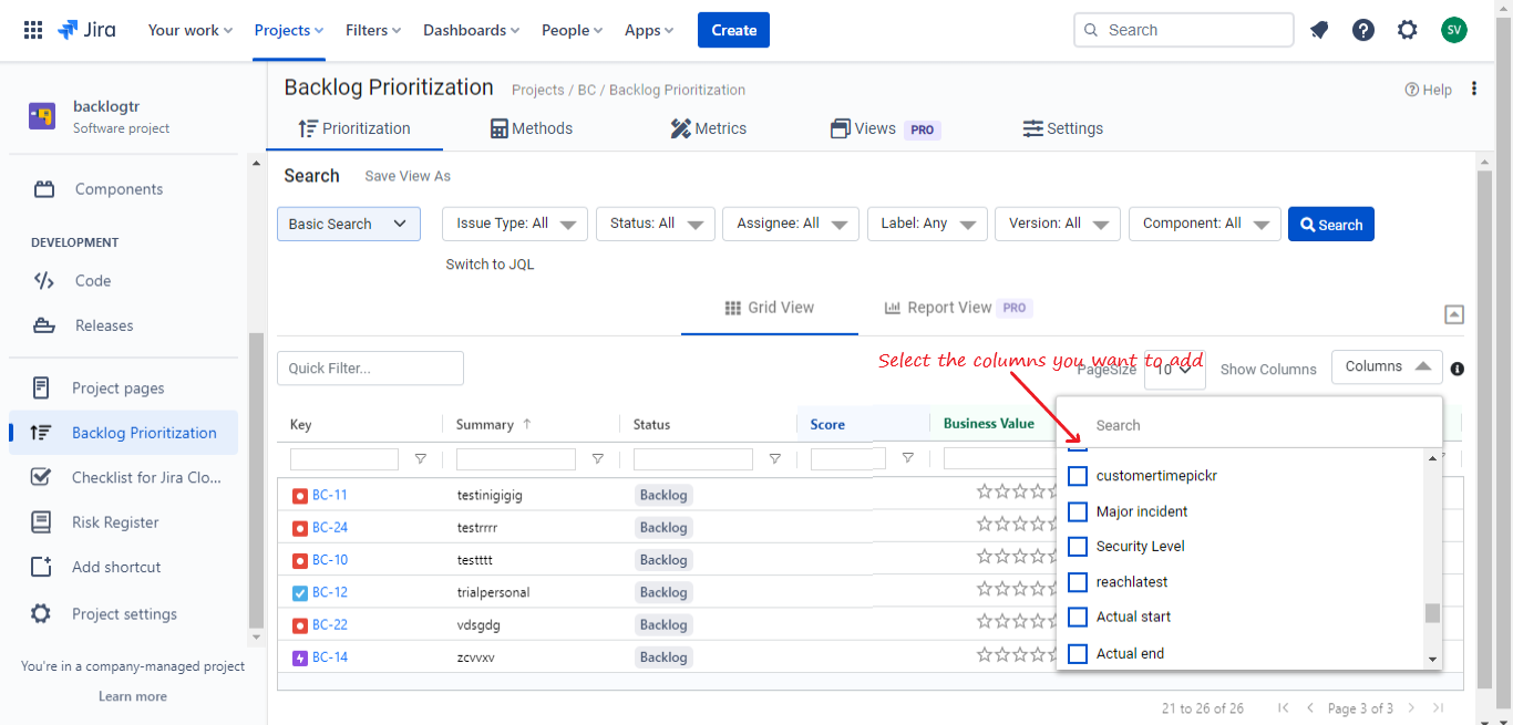 The Backlog Prioritization Grid View comes with a default set of columns based on the backlog prioritization method chosen, you can view and assign values to the metrics and change the prioritization scores. The grid view can also be customized to suit your project needs by adding columns that are of importance to you .
