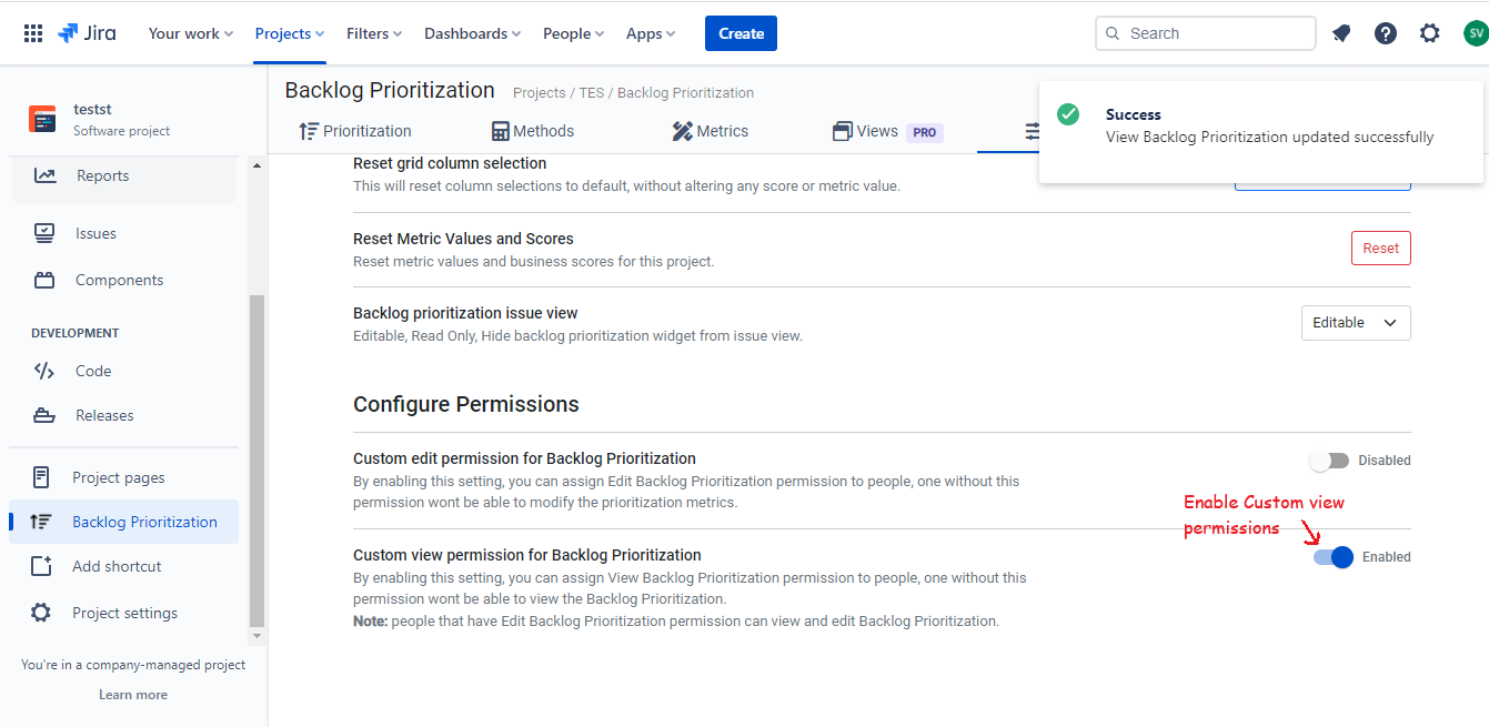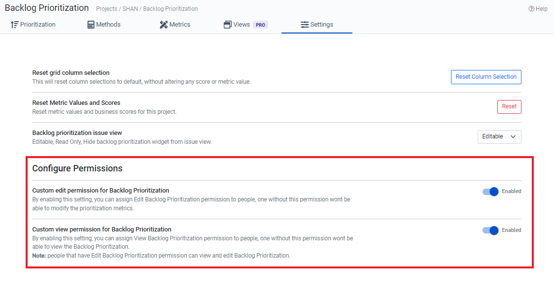 Admins may wish to control which user has a view or edit permissions of the Backlog prioritization feature within the project. For that flexibility, we have added the permission feature and now have a Configure Permissions section within the Backlog Prioritization settings page.