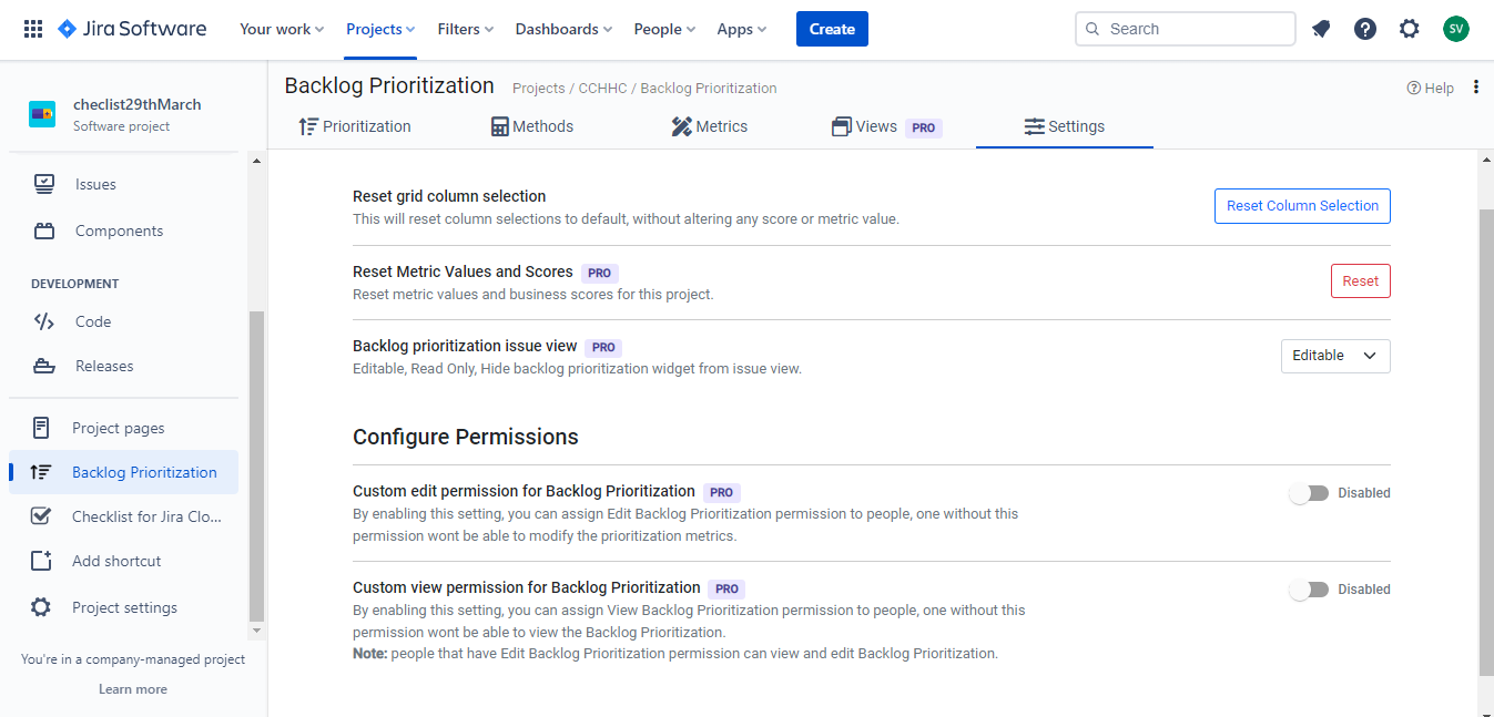 Configure Permissions: By default, a normal Jira User (without Jira Administrator privileges)will not have access to the Methods, Metrics, Views, and Settings tabs on the Backlog Prioritization page. Admins may need flexibility to provide access to certain groups or individual users, keeping that in mind 2 new permission settings have been added