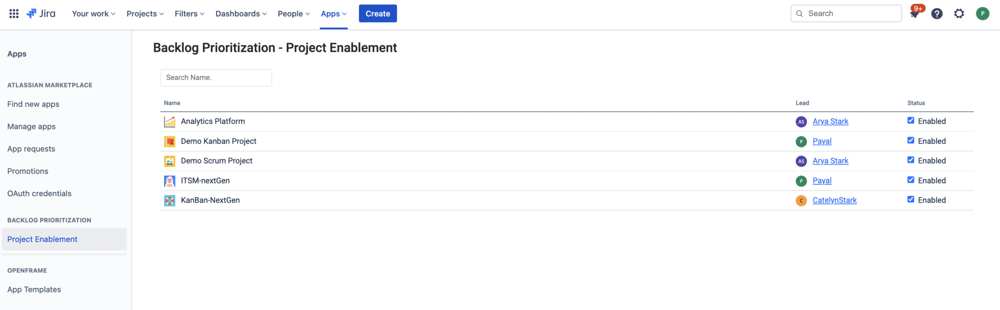 Here you can enable/disable the app on a single page. To do this, navigate to โManage your appsโ. Select โProject Enablementโ under Backlog Prioritization on the left side.