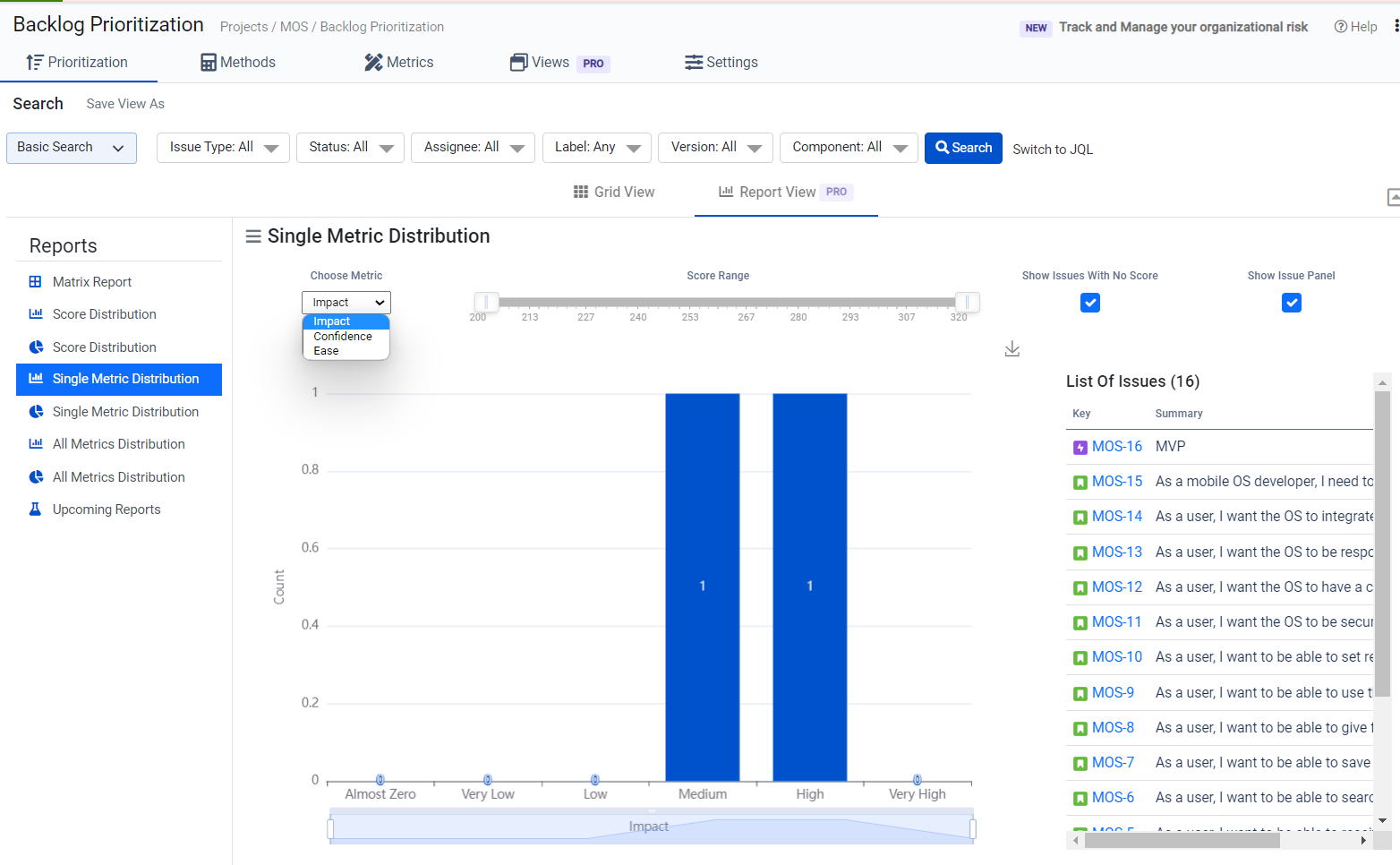 In essence, a metric distribution report adds another layer of analysis to your backlog prioritization efforts, allowing you to explore and interpret the variations and trends in metric values. This knowledge can guide you in making strategic choices about how to allocate resources and which items to prioritize for maximum impact.