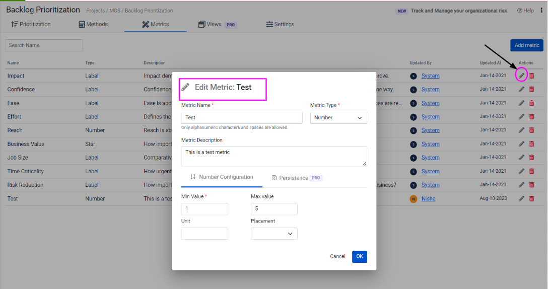 Edit Metrics: Within the Metrics tab, identify the metrics you intend to revise. This is accomplished by clicking on the pencil icon associated with the particular metric in question.