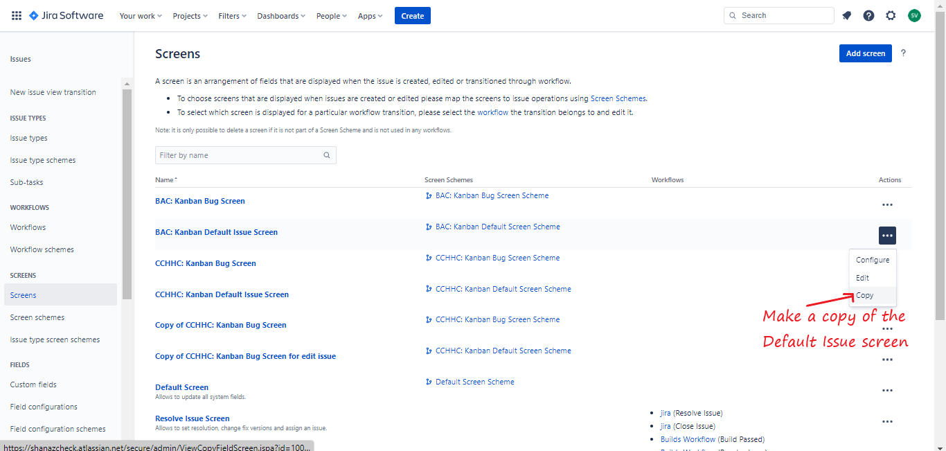 Once you have copied the screen, click on Configure and add the custom field to that screen.