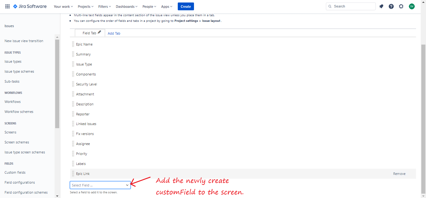 Now go back to Project Settings>Issues>Screens and click on the edit icon beside the Default Screen Schema