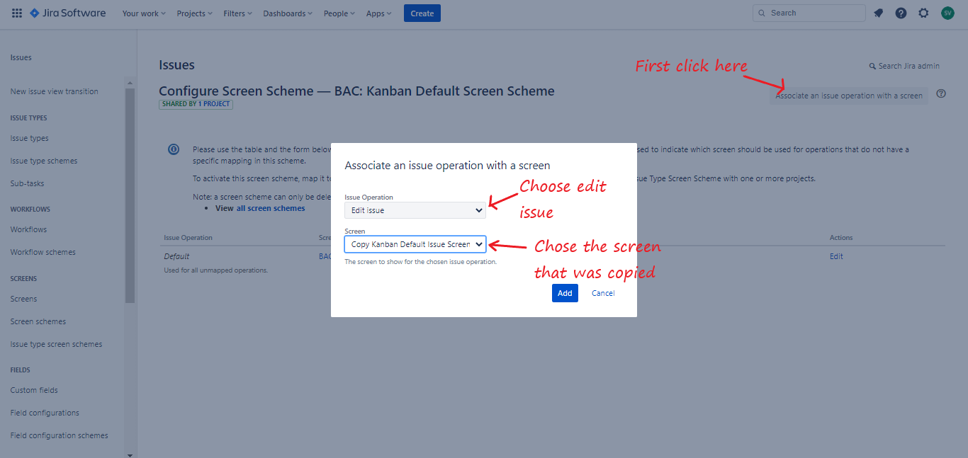 Now Associate an issue operation with a screen and selected edit issue in the operations dropdown and chose the copied screen.