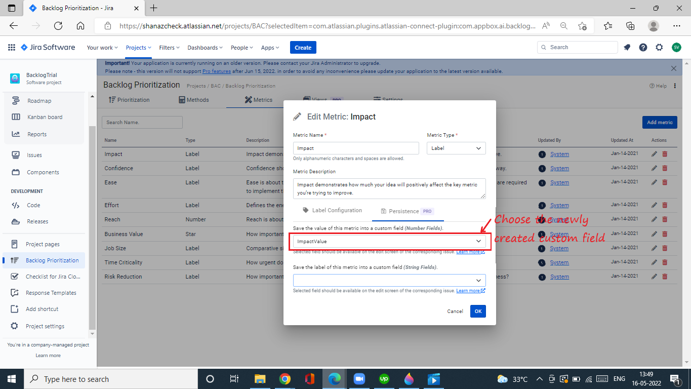 Once this is done, now you can go to Backlog Prioritization >Metric or Method tab .Edit the desired metric or method and while going to the Persistence tab you can save the value of the method or metric into the custom field.