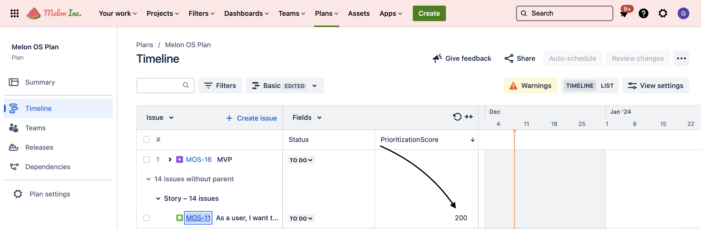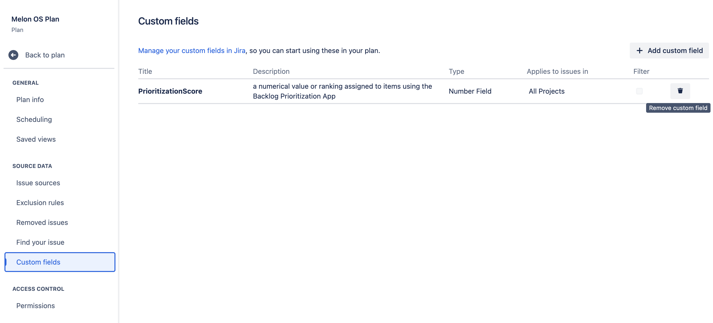 Please note - To show this field on Jira Roadmap / Plans, you need to add this Custom Field first under plan settings. In the example screenshot below, the custom field is Prioritization Score.