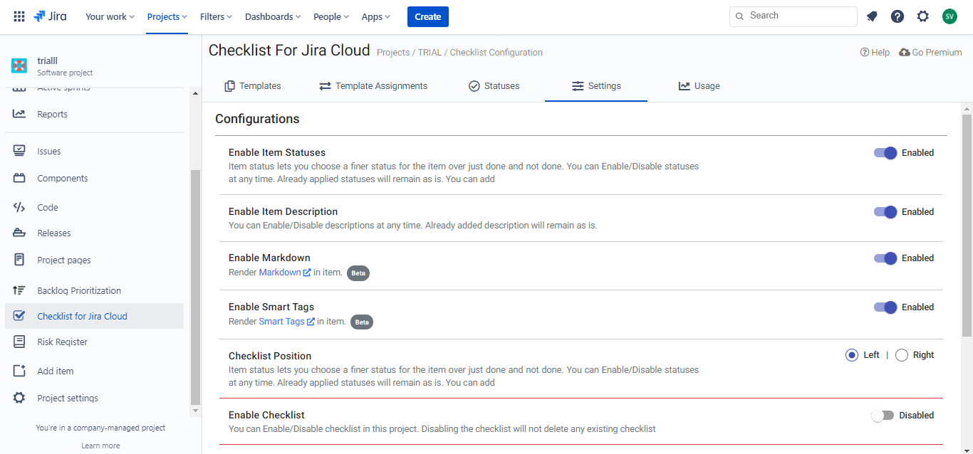 We understand that companies have different requirements so in order to change the position of the checklist you can go to Checklist for JIRA cloud ->Settings->Checklist Position .