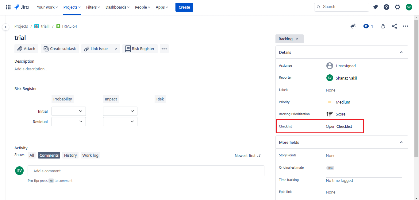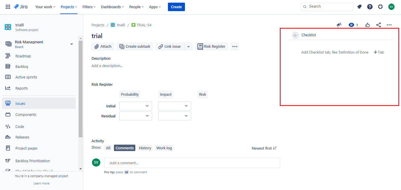 By default the Checklist is positioned on the left side of the JIRA issue Page.