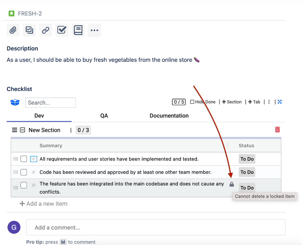 Locking a checklist item provides a powerful safeguard. By simply locking one or more checklist items within a template, users are prevented from accidentally deleting those items.