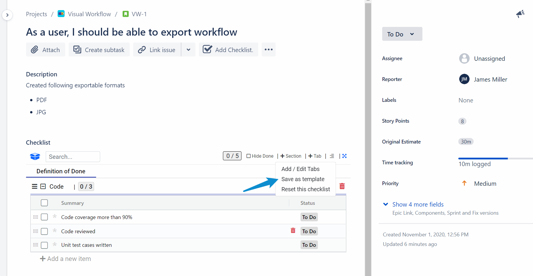 Once you are inside a ticket, you can save it as a template, this template can then be used to auto load tickets with a checklist in the future.
