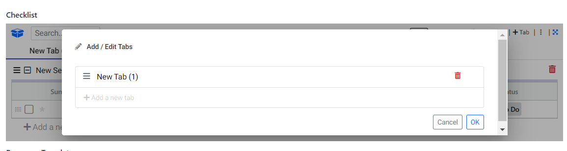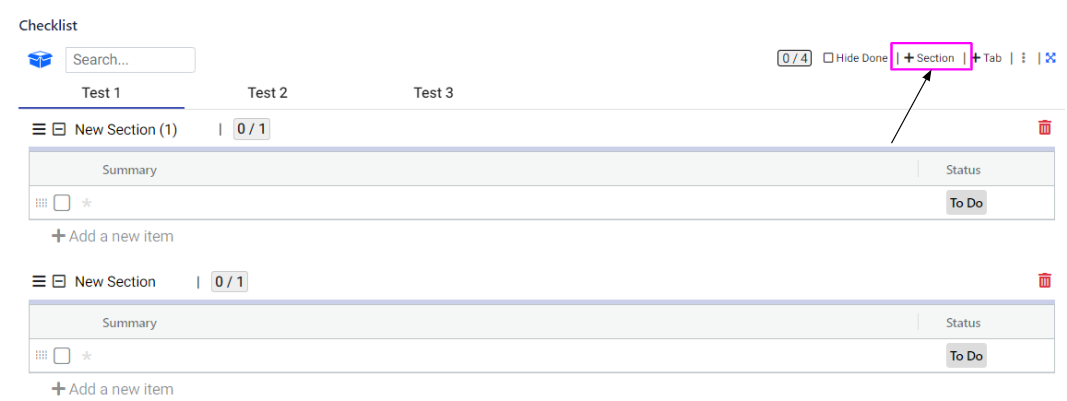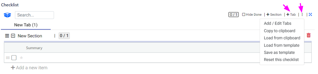 To create a new section within the current tab, go to the top right of your checklist.