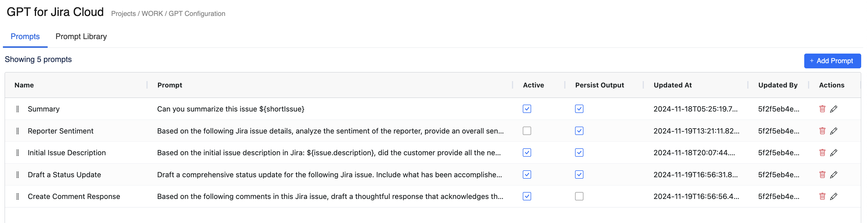 The Prompts tab shows a list of pre-configured prompts that are available for use in Jira Cloud. Each row represents an individual prompt, with details such as its name, prompt text, whether it is active, whether to persist output, and other metadata like last updated date and user who updated it. Here is a breakdown of the information available: