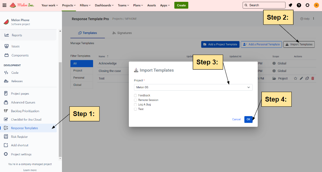 To import templates from another project, follow these steps: