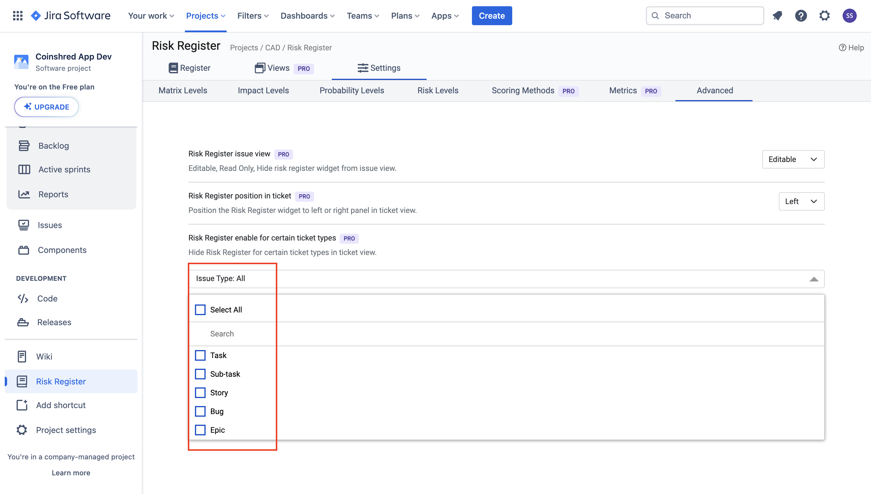 You can Enable / Disable the Risk Register for certain issue types. To access the Risk Register feature within a specific Issue Type follow these steps: