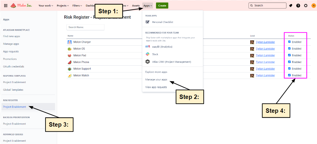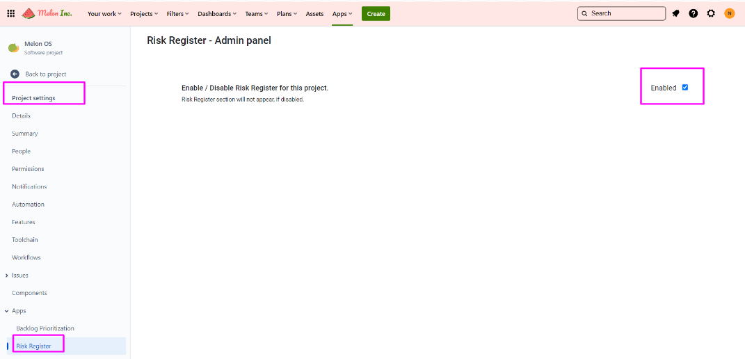 Locate and choose "Risk Register" from the list of available apps and click on Project Enablement.