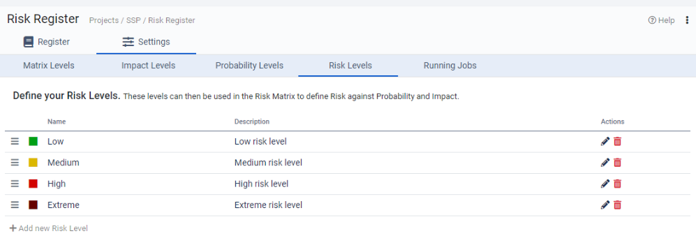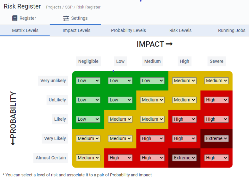 Fully customizable Risk matrix where you can add your own impact and probability levels and decide the risks based on your project requirements.