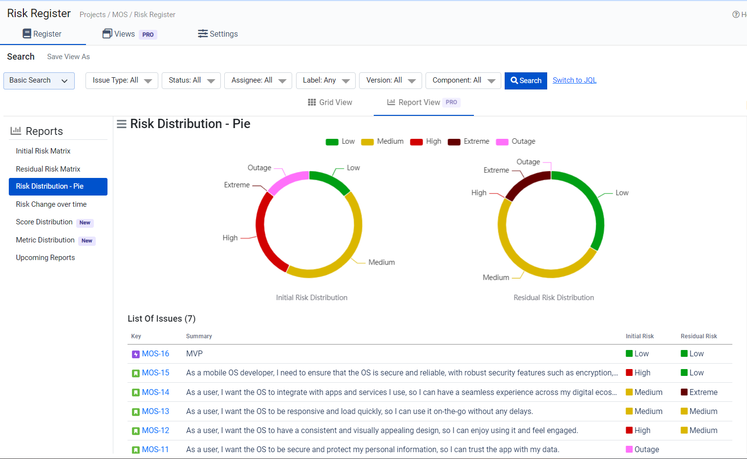 The Risk Distribution Pie offers an alternative visual representation for understanding the distribution of tickets based on the assigned risks. This feature allows stakeholders to gain quick insights into the risk landscape. Here's how it works: