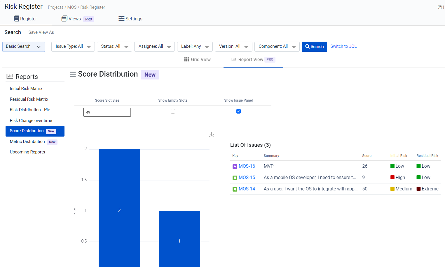 A Score Distribution Report in a Risk Analyzer is a visual representation that provides insights into how risk scores are distributed across a set of risks or issues. This report is particularly useful in risk management and assessment processes.